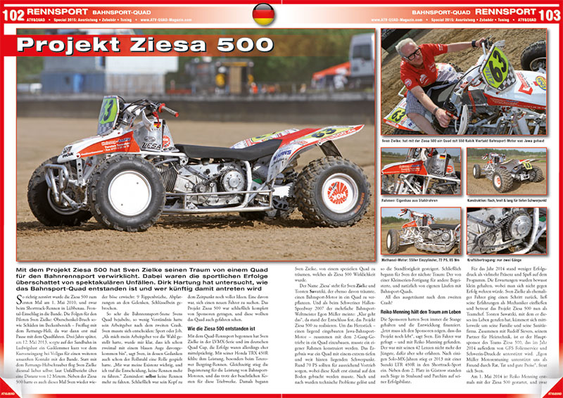 Mit dem Projekt Ziesa 500 hat Sven Zielke seinen Traum von einem Quad für den Bahnrennsport Wirklichkeit werden lassen. Dabei waren die sportlichen Erfolge stets überschattet von spektakulären Unfällen. Dirk Hartung hat untersucht, wie das Bahnsport-Quad entstanden ist und wer künftig damit antreten wird.