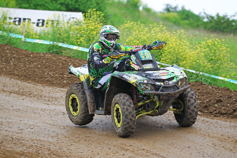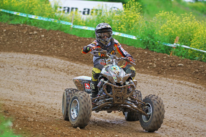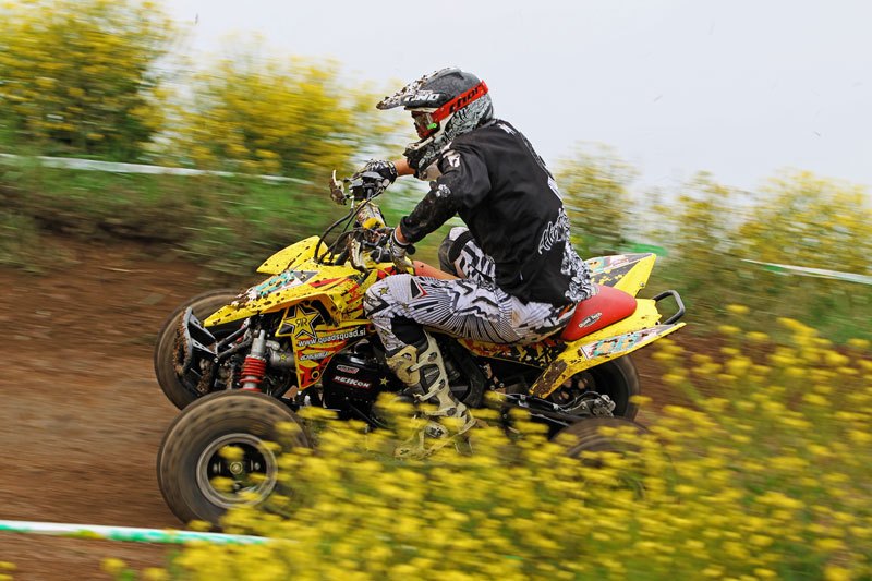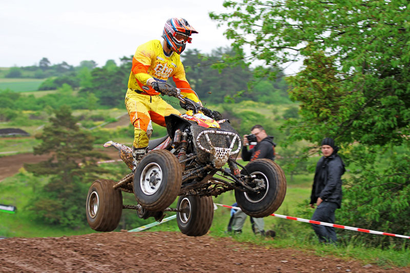 Die meisten der ATV-Akteure hätten sich wohl eher Wetter wie in Walldorf gewünscht, um den Sportquads der Klasse B Paroli bieten zu können. Unter Top-Bedingungen wie in Marisfeld waren aber dieses Mal die Akteure ohne Allrad im Vorteil, sofern man einmal von Marko Jager vom Team moto-sport.si absieht. Was dieser Mann mit der massigen Can Am bisher an den Tag gelegt hat, ist mit Worten schon fast nicht mehr beschreibbar. Leider hat der Untersatz diese Hatz aber bisher nur schwerlich verdaut und war entweder ziemlich angeschlagen oder erst gar nicht im Ziel angekommen. Für Marisfeld lautete deshalb unmissverständlich das Motto, Schad frei das Ziel zu erreichen. Zwar mäßigte Jager im gesamten Rennen an den Sprüngen sein Tempo merklich, aber am Schluss hatte er dennoch fast das gesamte Feld zweimal überrundet. Nur wenige Piloten hatten das Vergnügen Jager nur einmal zu begegnen. Bis auf den Start, den Jürgen Gröpl (Dinli Austria / Schantl Racing) für sich entscheiden konnte, lag niemand außer Jager an der Front der Klasse Quad Sport B.