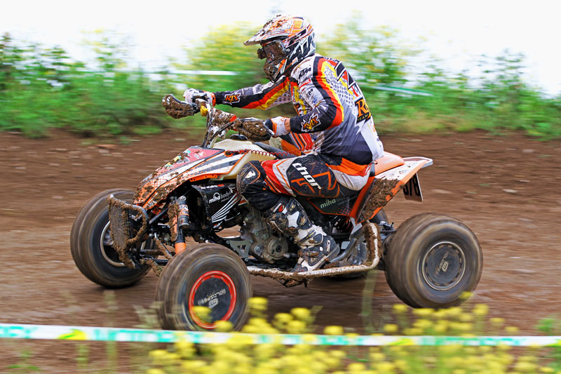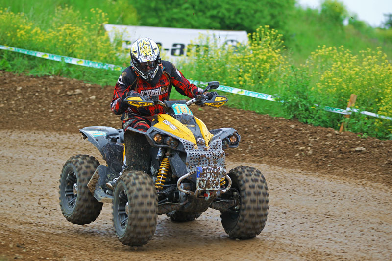 Nur zu oft schon mussten die Protagonisten der Vierradszene die Pistenräumung beim ersten Rennen am sonntäglichen Morgen übernehmen, da nächtlicher Regen die Strecken verschiedenster GCC-Events in wahre Fango-Areale verwandelt hatte. Doch in Marisfeld hatten die Quad- und ATV-Akteure ausgesprochenes Glück mit dem Wetter: Es hatte in der Nacht zwar auch angefangen zu regnen, aber Petrus hatte pünktlich zum Start des Rennens die Himmelschleusen wieder geschlossen. Die dünne Schmierschicht, die sich dadurch auf der Strecke bildete, war für die breitbereiften Einsatzgeräte höchstens für ein oder zwei Runden von Nachteil, danach herrschte aber auf dem harten Boden darunter enormer Gripp in nahezu allen Lagen.
