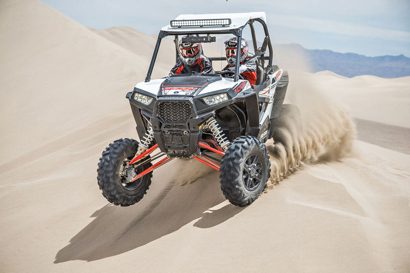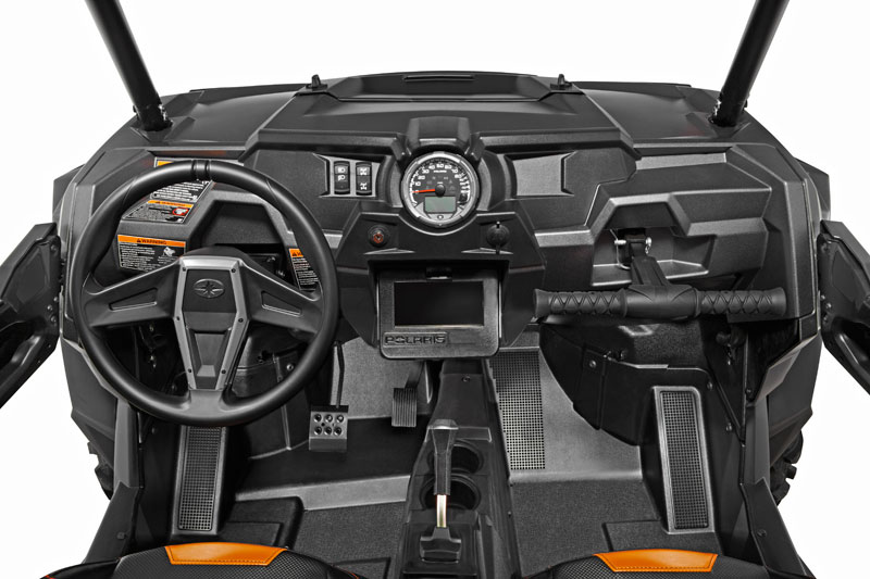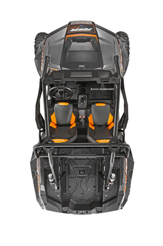 Ein Highlight im Wortsinn stellen die Räder dar: Als erster Hersteller verbaut Polaris in einem Serien-Side-by-Side-Fahrzeug 29-Zoll-Walzen Maxxis Bighorns in der Dimension 29×9-14 vorne und 29×11-14 hinten. Ellenlang auch der Radstand, welcher mit 2.286 mm jenen des bisherigen Polaris-Topmodells RZR 900 um 218 mm und den der Mitbewerberin Can-Am Maverick um 127 mm übertrifft. Keine Kompromisse auch bei den Stoßdämpfern: An die vorderen doppelten A-Arms greifen voll einstellbare 2-Zoll-Shocks von Walker-Evans mit 406 mm Federwegen, an den hinteren 3-Punkt-Längslenkern sind 2,5-Zoll-Dämpfer desselben Herstellers mit einem Federweg von 457 mm für die Absorption von Stößen zuständig. Nicht zuletzt gewährt die neue Hinterachs-Konstruktion mit 343 mm rund 25% mehr Bodenfreiheit, immerhin 13 mm mehr als beim bisherigen Primus in dieser Disziplin, der Arctic Cat WildCat 1000.