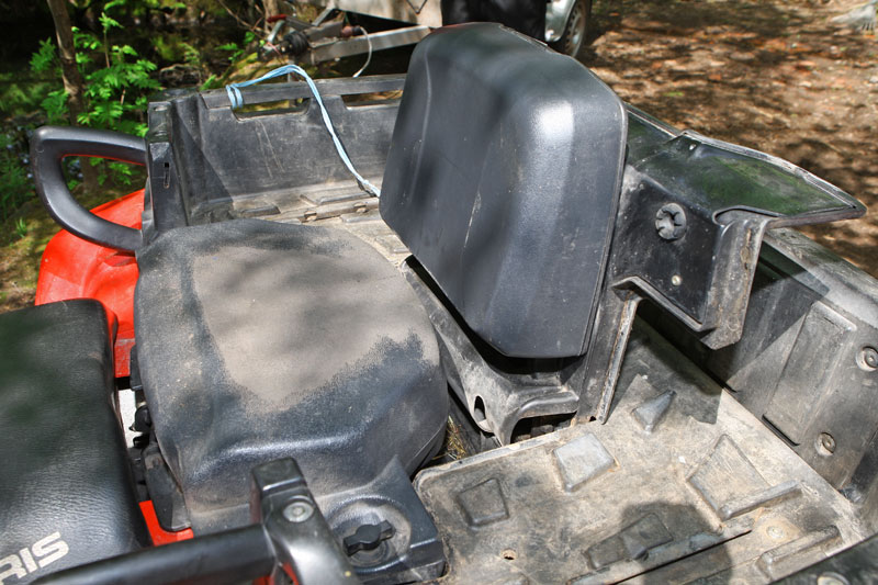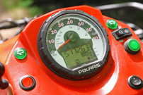 Wolfgang Schmitt aus dem Spessart, hier als ‚Onkel Schmitti‘ bekannt, hat diese Distanz mit seiner Polaris Sportsman 700 X2 abgespult, und das in nur drei Jahren. Im Jahr 2009 hat er das Fahrzeug bei Polaris-Händler Harald Freppon in Laufach gekauft. Harald kannte Onkel Schmitti bereits und ahnte, dass auf dieses Fahrzeug keine alltägliche Belastung zukommen würde. Schließlich nutzt Wolfgang das ATV bei seiner Arbeit im Forst ebenso wie für ausgedehnte Wochenend-Touren mit seiner Frau Johanna. Aus diesem Grund tauschte Freppon den serienmäßig verbauten Riemen der CVT-Variomatik gegen einen verstärkten aus, den Polaris in seinem sportlichen Side-by-Side ‚RZR 800‘ verwendet. Außerdem montierte der Polaris-Händler einen Satz grobstollige PKW-Straßenreifen: Maxxis ‚Trepador Radial‘ in der Dimension 205/70-R15 sorgen nun für den Straßenkontakt. Auf dem leichten ATV dürften sie für rund 100.000 Kilometer gut sein. „Außerdem verbraucht meine Sportsman damit nur noch 8 Liter auf 100 Kilometer“, schwärmt Wolfgang, dessen Fahrweise alles andere als spritsparend ist.