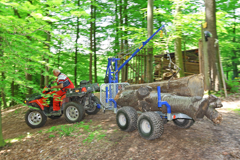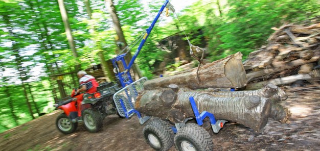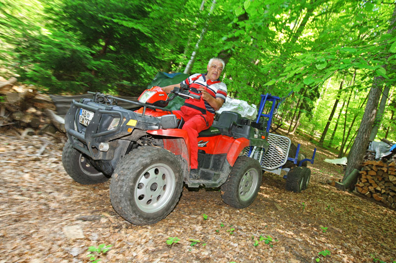 Dazu verwendet er seine Polaris Sportsman sowie einen ungebremsten Holzrückewagen mit Pendel-Achse, dessen Kran mit einer Handkurbel betätigt wird – sicherlich keine innovative Lösung, doch an diesem Ort durchaus sinnvoll: Das Gelände ist steil, und es gibt nur wenige Wege, so dass die Arbeit mit schwerem Gerät großen Aufwand bedeutet und beachtliche Flurschäden hinterlässt.