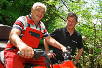 Nicht so mit dem leichten Holzrücke-Zug. Der Allrad-Antrieb des ATVs schaltet bei durchdrehenden Hinterrädern automatisch die vorderen dazu, und bergab sorgt das ‚Active Decence Control‘ System (ADC) von Polaris dafür, dass die Motor-Bremskraft gleichmäßig auf alle vier Räder verteilt wird. Ein nicht übermäßig schwer beladener Rungen-Hänger lässt sich damit locker ziehen, zumindest bis zu ‚Onkel Schmittis Hütte‘. „Einmal habe ich mit meinem Rückezug einem Nachbarn geschlagenes Holz aus einer Schlucht geholt, nachdem der beim Versuch, das Material mit einem schweren Traktor abzufahren, das Fahrzeug schwer beschädigt hatte“, sagt Wolfgang, der mit Aktionen wie diesen nicht nur den Respekt der umliegenden Waldbesitzer gewonnen hat – mittlerweile wird er von diesen auch zunehmend um die Erledigung schwieriger Spezial-Aufgaben gebeten.