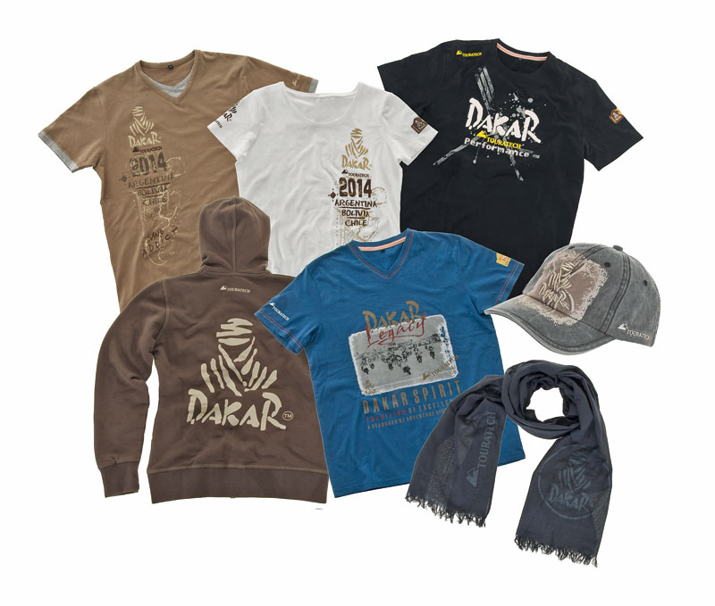Vor diesem Hintergrund wurde in enger Abstimmung mit dem Veranstalter ASO eine eigene Dakar-Kollektion aufgelegt. Aus der limitierten Touratech-Sonderedition sind jetzt schon aufwendig gestaltete Shirts im Damen- und Herrenschnitt, verschiedene Touratech: Katalog 2014 / 2015Caps, eine modische Kapuzenjacke, Schal und Mütze für kalte Tage sowie ein Mousepad im exklusiven Dakar-Design erhältlich. Weitere Produkte wie Jacken, Taschen, Caps, Rucksäcke und Rack-Packs werden folgen.