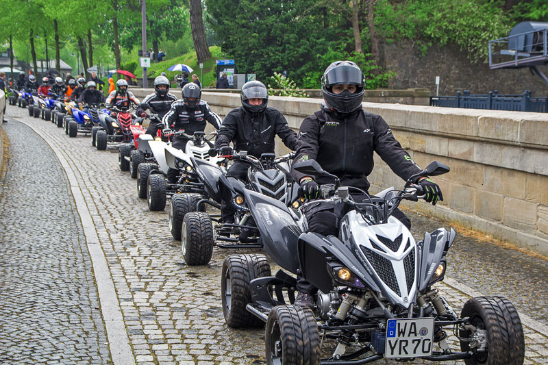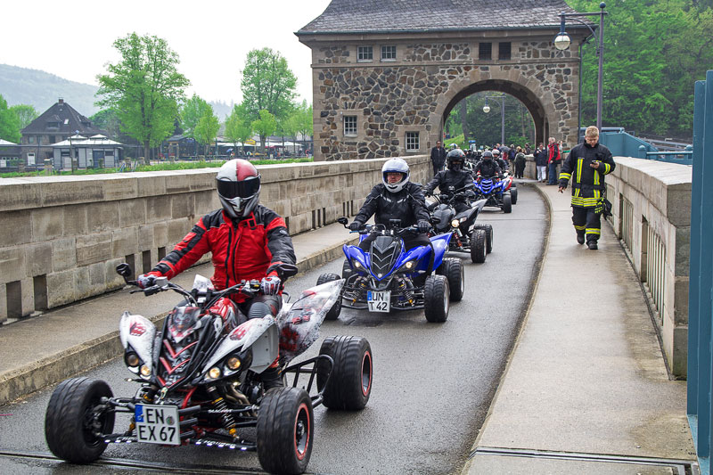 Umso schöner sind die winkenden und lachenden Kinder in den Dörfern, die Erwachsenen, die die ungewöhnliche Kolonne filmen und das Bild, wenn sich mehr als 70 Quads an der Raststätte zum Parken aufreihen. Zwischen Cola und Schnitzel begutachten die Männer und eine Handvoll Frauen gegenseitig ihre Maschinen, holen sich Tipps für den nächsten Umbau, fachsimpeln beim Essen über Motoren, Lackierungen und Feintuning. Zwischendurch zücken einige Fahrer die Smartphones und kontrollieren die Wettervorhersage. Denn pünktlich zur Abfahrt, dem Höhepunkt vom Raptor Community Treffen 2014, wird es nass: Auf dem Weg zur Edersee-Staumauer prasselt der Regen auf die Helme.