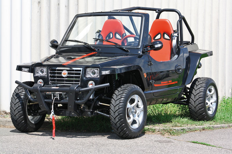 Wurde der Allrad-Buggy anfangs in Jeep-Optik mit Rund-Scheinwerfern, Stoff-Verdeck und ohne Türen geliefert, legt der Hersteller jetzt nach und bietet das Fahrzeug auch mit massivem Front-Bumper und Türen an, so dass der Einstieg in das Fahrzeug nunmehr auch ohne juveniler Schwung und Übermut erfolgen kann. „Rund die Hälfte der KundInnen wünschen sich Türen“, weiß Jörg Braun.