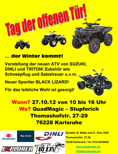 Die neuen Modelle von CF Moto, Dinli, Suzuki und Triton stehen im Mittelpunkt auf dem Tag der Offenen Tür bei QuadMagic in Karlsruhe, der am kommenden Samstag, den 27. Oktober 2012, stattfindet. Neben der Centhor von Dinli, der Defcon von Triton, dem KingQuad von Suzuki und der Terralander von Explorer wird auch Zubehör präsentiert, welches an diese Fahrzeugen angebaut werden kann; jetzt zum Winter hin werden natürlich vor allem Schneepflüge und Salzstreuer gezeigt. Doch auch der Spaß kommt nicht zu kurz: Nben der Ausrüstung für den winterlichen Räumdienst und weiterem Arbeitsgerät eröffnet die Sportlerin ‚Black Lizard‘ von Triton bereits Aussichten auf eisfreie Ausfahrten im kommenden Frühjahr, schließlich veranstaltet QuadMagic auch Ausfahrten und Touren.