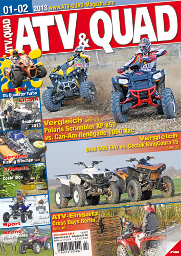 Die Ausgabe ATV&QUAD 2013/01-02 ist ab Mittwoch, den 16. Januar 2013, am Kiosk erhältlich. Neben dem 2. Teil der Messe-Neuheiten für 2013 stehen zwei Vergleichstests im Mittelpunkt: Die brandneue Polaris Scrambler XP 850 tritt gegen die Can-Am Renegade 1000 Xxc an und die Cectek KingCobra T5 gegen die Dinli EVO 565. Ein bisschen überirdisch: Die beiden GG Quadster Turbo von Hanno und Mercy Hettinger mit weit über 200 PS sind auf dem Poster im Mittelaufschlag präsentiert. Und in Sachen Erlebnis zeigen wir, wo sich in Costa Rica Side-by-Sides und Quads für Dschungel-Touren mieten lassen…