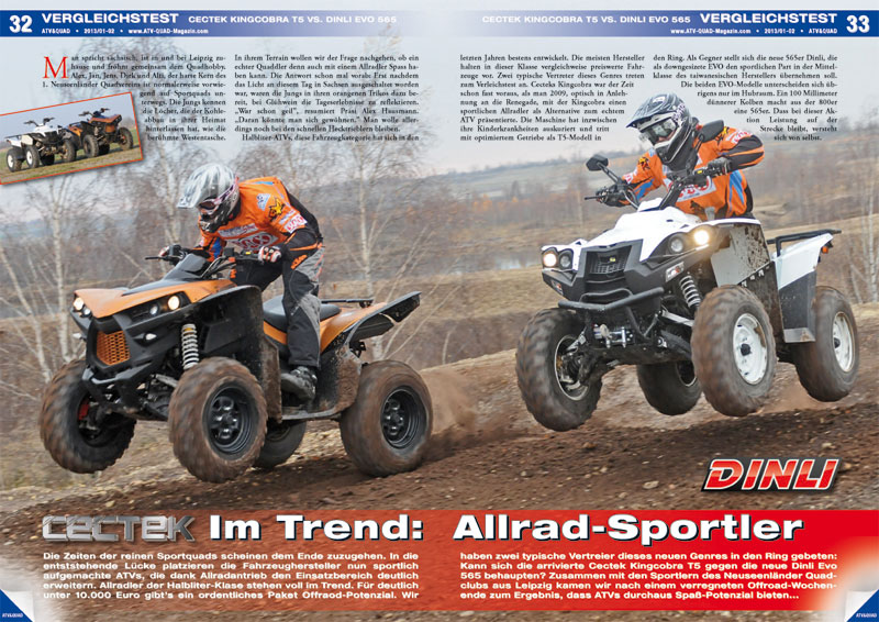 Die Zeiten der reinen Sportquads scheinen dem Ende zuzugehen. In die entststehende Lücke platzieren die Fahrzeughersteller nun sportlich aufgemachte ATVs, die dank Allradantrieb den Einsatzbereich deutlich erweitern. Allradler der Halbliter-Klase stehen voll im Trend. Für deutlich unter 10.000 Euro gibt’s ein ordentliches Paket Offraod-Potenzial. Wir haben zwei typische Vertreier dieses neuen Genres in den Ring gebeten: Kann sich die arrivierte Cectek Kingcobra T5 gegen die neue Dinli Evo 565 behaupten? Zusammen mit den Sportlern des Neuseenländer Quadclubs aus Leipzig kamen wir nach einem verregneten Offroad-Wochenende zum Ergebnis, dass ATVs durchaus Spaß-Potenzial bieten… Ab Seite 32…