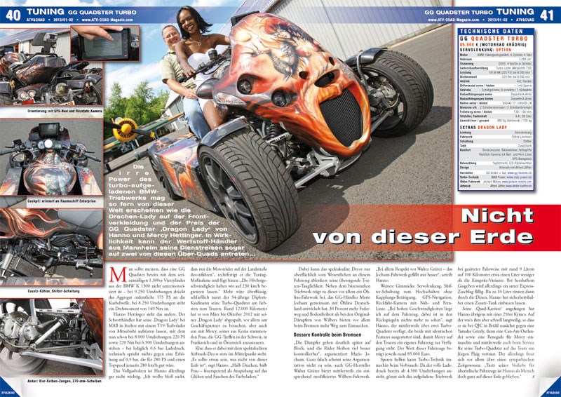 Nicht von dieser Erde: Die irre Power des turbo-aufgeladenen BMW-Triebwerks mag so fern von dieser Welt erscheinen wie die Drachen-Lady auf der Frontverkleidung und der Preis der GG Quadster ‚Dragon Lady‘ von Hanno und Mercy Hettinger. In Wirklichkeit kann der Wertstoff-Händler aus Mannheim seine Dienstreisen sogar auf zwei von diesen Über-Quads antreten.