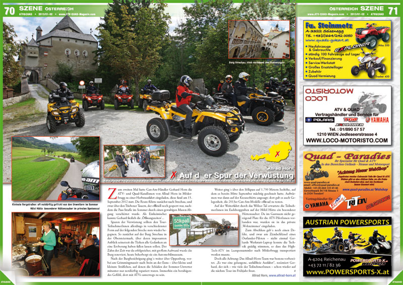 Allrad Horn: Auf der Spur der Verwüstung. Zum zweiten Mal hatte Can-Am-Händler Gerhard Horn die ATV- und Quad-KundInnen von Allrad Horn in Möderbrugg zu einer Herbstausfahrt eingeladen, diese fand am 15. September 2012 statt. Die Route führte zunächst nach Strechau, und zwar über den Triebener Tauern, der offiziell noch gesperrt war, nachdem die Pass-Straße im Sommer durch einen gewaltigen Muren-Abgang verschüttet wurde. Als Einheimischer kannte Gerhard freilich die ‚Öffnungszeiten‘…