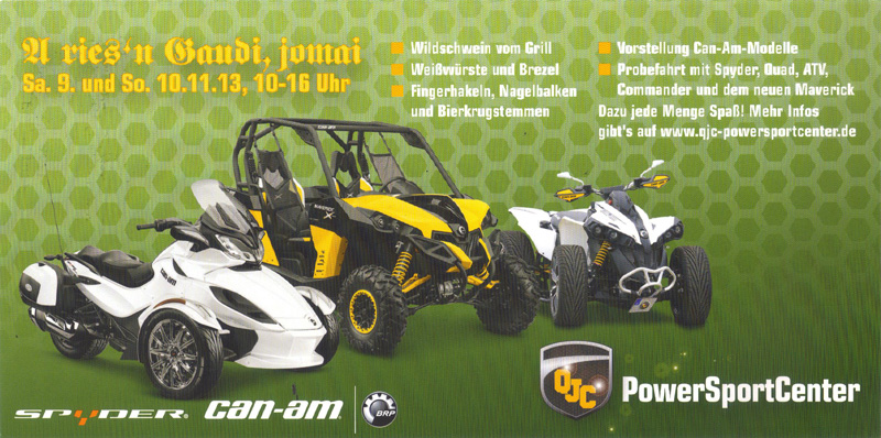 Auf dem QJC Oktoberfest 2013 stellt das Team um Jürgen Flaig einen Riesen-Gaudi in Aussicht: Gefeiert wird am 9. und 10. November 2013 jeweils von 10 bis 16 Uhr. Während der diesjährigen ‚Can-Am-Days‘ präsentiert der Vertragshändler in Nord-Baden die aktuellen Quads, Roadster und ATVs von Can-Am, GG Grüter + Gut, Kawasaki, Kymco, Suzuki, TGB und Yamaha. Dabei können alle Interessierten unter fachkundiger Anleitung Probefahrten und Kurz-Touren durch Brühl und in die nähere Umgebung unternehmen. Neben den zahlreichen ausgestellten Drei- und Vierrädern gibt es an beiden Tagen ein abwechslungsreiches Oktoberfest-Programm mit Überraschungen.