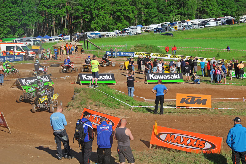 Dann geschah das völlig Unerwartete: Kevin Ristenbieter haderte beim Überrunden einer langsameren Gruppe am 180-Grad-Knick vor dem Fahrerlager. Mit dem Vorderrad am inneren Anlieger einfädelnd, einen kapitalen Überschlag produzierend, wurde er äußerst unsanft vom Quad katapultiert. Diese Gelegenheit gereichte Max Freund zum sicheren Nachhausefahren des Quad-Pro-Sieges.
