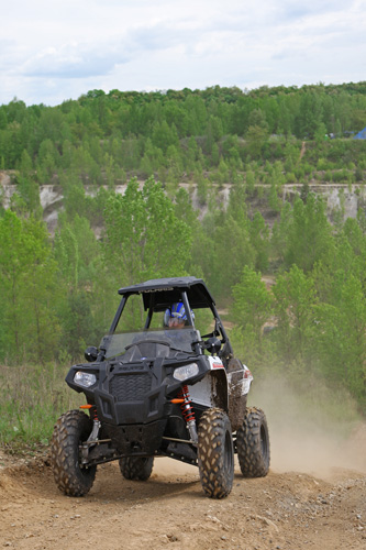 Nachdem wir den Schriftkram für die Teilnahme am Offroadfahren beim Polaris & Friends Treffen 2014 erledigt hatten und uns ein weiteres Bändchen um das bunte Handgelenk geschmiedet wurde, ging es endlich los. Es hieß aufsitzen und eine erste Runde im Tagebau drehen. Unser Tourguide bog mit dem Side-by-Side in den Tagebau ein und fuhr mit uns eine nicht enden wollende Runde. Spaß pur!