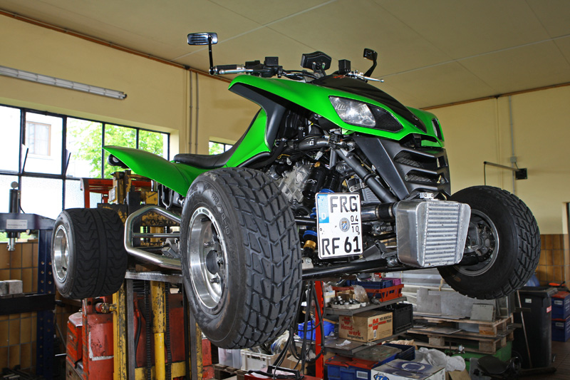 Auf den Brainwashing Days 2014 vom 1. bis 4. Mai wurde Richard ‚RR‘ Rabenbauer, im V-Force-Forum ehrfurchtsvoll ‚Sir‘ genannt, nun denn auch offiziell zum Ritter geschlagen. Eingeladen waren Auserwählte, die aus technischer Sicht eine echte Sensation erwartete: Die KFX 700 von Richards Sohn Florian, in den vergangenen Jahren stets als Projekt präsentiert, läuft mittlerweile – falsch: sie rennt! Mit Kompressor aufgeladen, stemmt ihr Triebwerk gewaltige 88 PS auf die Kurbelwelle, und das bereits bei einem Ladedruck von 0,55 bar – im ‚Hausfrauen-Modus‘ also, um etwaige Schwachstellen frühzeitig zu erkennen, bevor der Druck auf 1,2 bar erhöht wird.