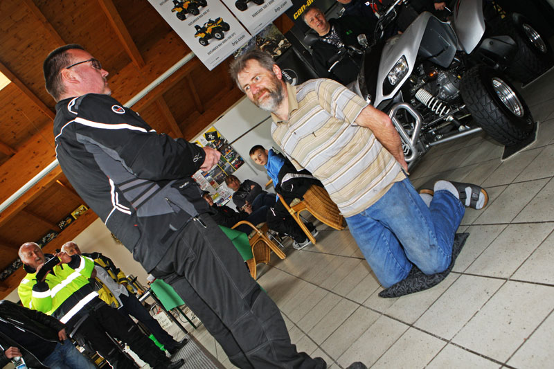 Um der guten Ordnung Genüge zu tun, hatten Roger und Markus ‚Supra‘ aus dem Kawasaki-VForce-Forum, als dessen inoffizielles Forumstreffen die Brainwashing Days 2014 gelten, eine stilechte mittelalterliche Zeremonie vorbereitet: Da RR im Forum mit ‚Sir‘ angeredet wird, war es an der Zeit, ihn nun endlich einmal offiziell zum Ritter zu schlagen.