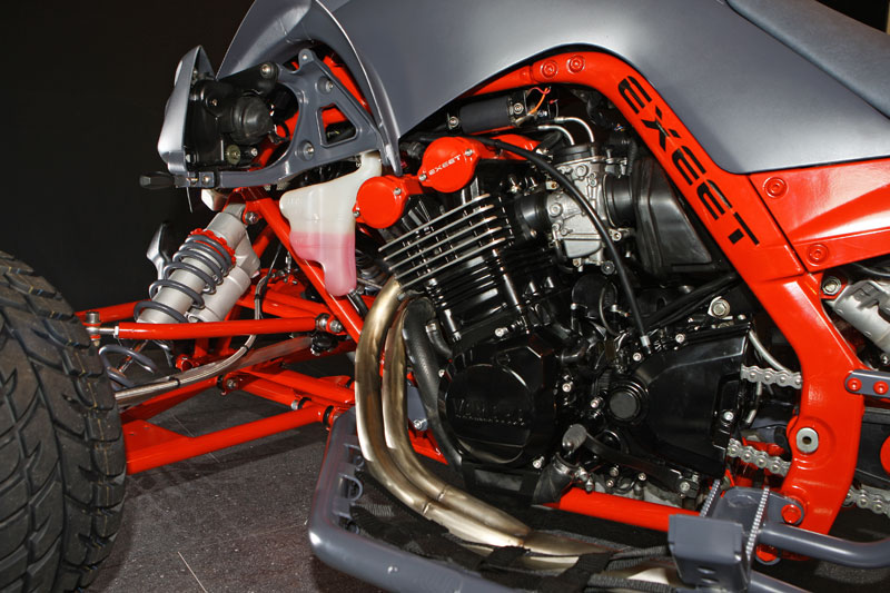 „Kein Serienquad hat genügend Leistung, als dass sich diese nicht noch steigern ließe“, argumentiert Sebastian Jornitz, und mit dem bulligen KTM-Zweizylinder hat der Hersteller aus Mechernich bereits für Gesprächsstoff in der Tuning-Szene gesorgt, siehe unseren Beitrag Exeet V990R: Yamaha PIMP mit KTM V2-Motor. Das Fahrzeug gefällt, eine Anschaffung scheitert allerdings oftmals bei den Kosten: 18.990 Euro zuzüglich Motor sind kein Pappenstiel, und so hat Exeet im Rahmen der Expansion auch ein Finanzierungspaket im Gepäck. „Finanzierung und Leasing sind bei uns kein Problem – Bonität und Prüfung durch die Bank vorausgesetzt,“ sagt Christian Kopp. Für den Aufbau der Exeet-Fahrzeuge hat er übrigens einen speziellen Mechaniker verpflichtet: einen KFZ-Ingenieur aus Portugal, der als leidenschaftlicher Buggy-Konstrukteur früher einmal im internationalen Rallye-Rennsport unterwegs gewesen ist.
