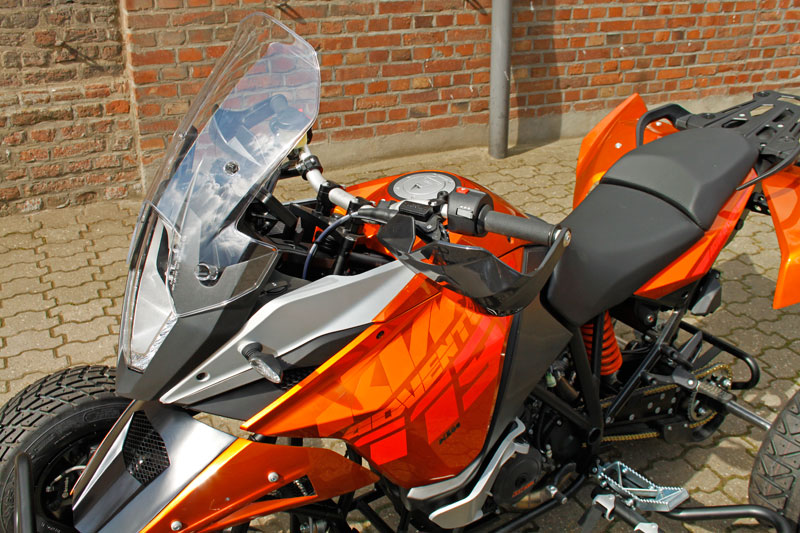 Wie bei den Quads von E.-ATV gewohnt, entsprechen Karosserie und Verkleidungsteile weitgehend dem Sportmotorrad, und so ist diesbezüglich gegenüber der 990er eine schöne Weiterentwicklung erkennbar: Selbst diejenigen, denen die Formensprache des KTM-Design-Gurus Gerald Kiska nicht gefällt, kommen nicht umhin zuzugeben, dass die E.-ATV 1190 Adventure alles andere als gewöhnlich auftritt.