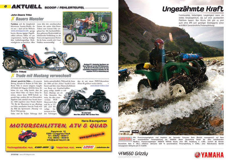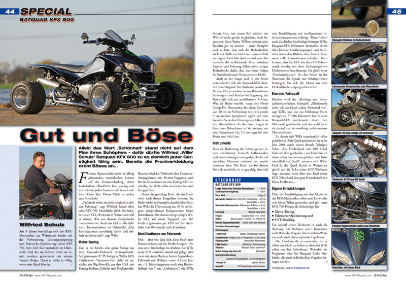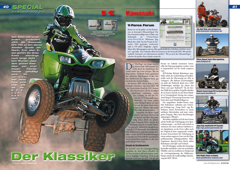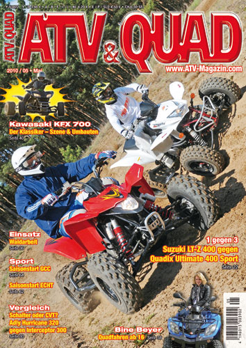 …ist am 7. Mai 2010 erschienen. Titel-Thema ist der Vergleich einer Quadix Ultimate Razzor 400 Sport mit der aktuellen Suzuki LT-Z 400 – kann die Chinesin der Japanerin das Wasser reichen? Weiterer Höhepunkt ist das KFX-700-Special; auf 12 Seiten berichten wir über Kawasakis Klassiker: über seine Technik und die Szene – Fahrer, PIMPs und Umbauten…