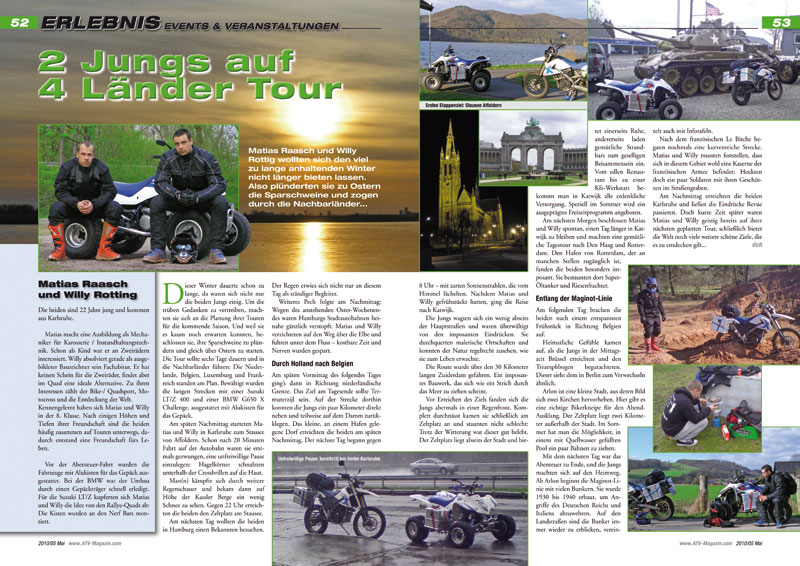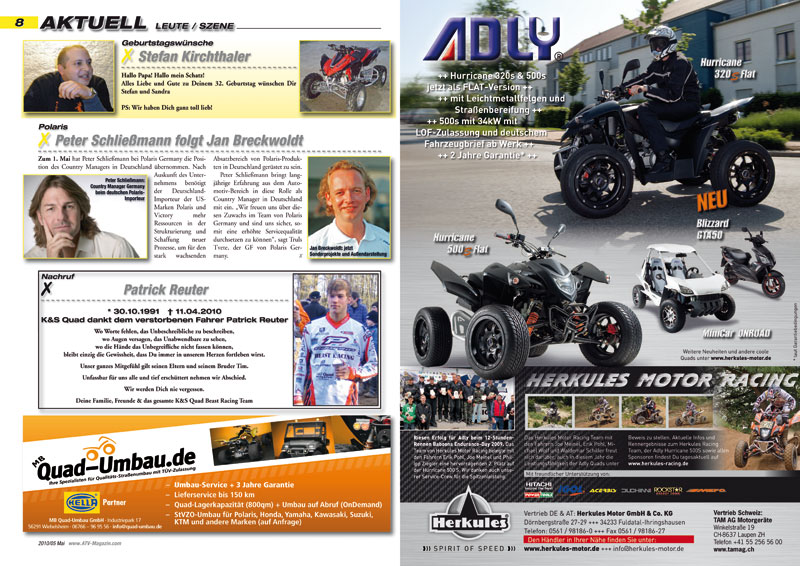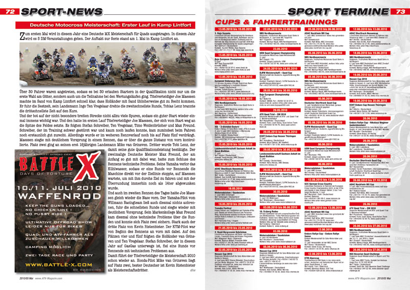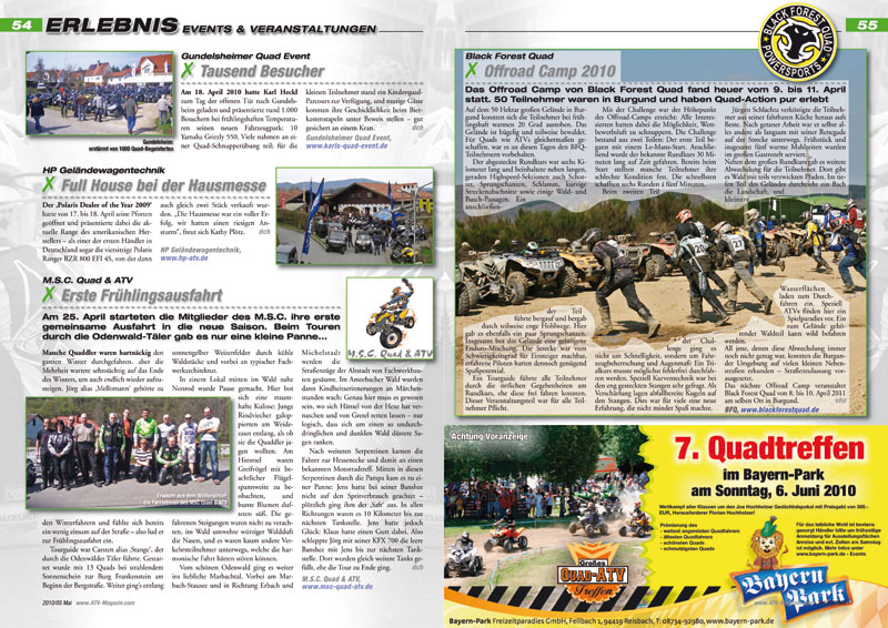 Gundelsheimer Quad Event: Tausend Besucher; HP Geländewagentechnik: Full House bei der Hausmesse; M.S.C. Quad & ATV: Erste Frühlingsausfahrt; Black Forest Quad: Offroad Camp 2010… Seite 55 und 56.