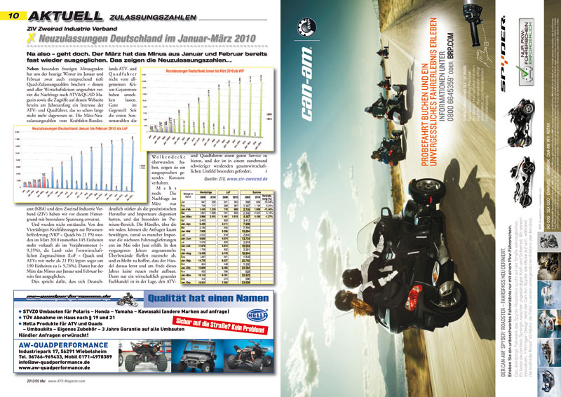 Ganz im Gegenteil. Heute habe ich allen Anlass, Ihnen & Euch freudvoll zu verkünden: Der Quad-Branche geht es – im Rahmen der gesamtwirtschaftlichen Umstände – eigentlich sogar richtig gut. Erkennbar ist dies sehr schön an den Neuzulassungszahlen, siehe Seite 10: Nach dem strengen Winter, der in den Monaten Januar und Februar in unserem Bereich dann doch deutlich die Kauflaune gedrückt hat, haben die ersten Sonnenstrählchen im März das Minus aus den beiden Vormonaten fast wieder ausgeglichen. Und wenn ich mich im Quad-Fachhandel umhöre, dann verraten sich selbst notorischste Jammerer und Wehklager mit Bemerkungen wie: „Es war schon schlimmer.“