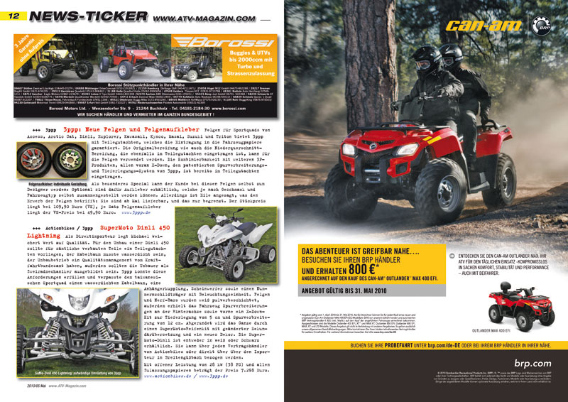 Innovationen und neue Produkte für ATVs, Quads, Buggys und UTVs werden ab Seite 12 präsentiert. In der aktuellen Ausgabe ATV&QUAD Magazin 2010/05: Neue Felgen und Felgenaufkleber von 3ppp; SuperMoto Dinli 450 Lightning von 3ppp / Actionbikes; Shock Covers nach Maß von Feldweech; Attackshox Profi Stoßdämpfer von Fourtec; neue Schmier- und Pflegemittel von Ipone; Querstabilisator für Can-Am von JS Spezial-Fahrzeuge; Quad-Paradies vertreibt Triton & Reaction in Österreich; Rogi Quad bietet Sondermodell WM Quad; Yamaha gewährt 500 Euro Prämie beim ATV-Neukauf; Tuning-CDI für Raptor 700 von Zweirad Voit.