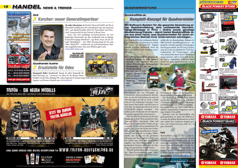 BookAndRide.de bietet ein Komplett-Konzept für Quadvermieter: Ein Software-System für die gesamte Abwicklung einer Quadvermietung, eine umfassende Vermarktungs-Strategie in Print + Online sowie günstige Neufahrzeug-Pakete – damit bietet BookAndRide alles aus einer Hand, was Quadvermieter für einen erfolgreichen Betrieb ihrer Unternehmen benötigen… Seite 19.