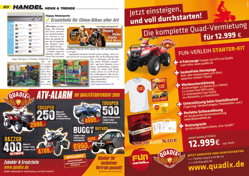 Karcher ist neuer Generalimporteur für Dinli in Deutschland und Österreich; Quadhandel Austria vertreibt Ersatzteile für Odes; BookAndRide.de: Komplett-Konzept für Quadvermieter; Happy Motorparts liefert Ersatzteile für China-Bikes aller Art. Ab Seite 18.