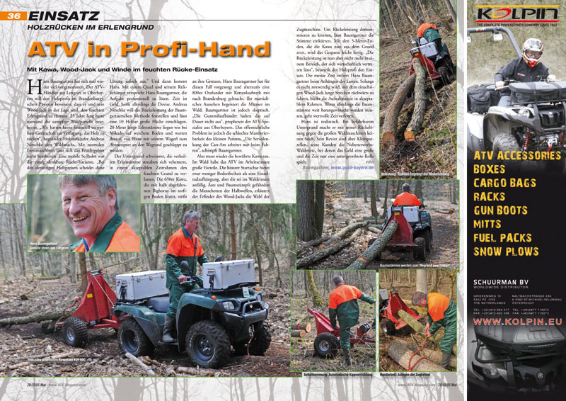 Hans Baumgartner hat sich mal wieder viel vorgenommen. Der ATV-Händler aus Lengries in Oberbayern will den Holzprofis im Brandenburgischen Päwesin beweisen, dass er und sein Wood-Jack in der Lage sind, den feuchten Erlengrund zu räumen. 25 Jahre lang hatte niemand die sumpfige Waldparzelle bearbeitet. „Wir hatten keine finanziell vertretbare Gerätschaft zur Verfügung, das Holz zu rücken”, begründet Holzaufkäufer Andreas Nitschke den Wildwuchs. Mit normalen Forstmaschinen lässt sich das Feuchtgebiet nicht bearbeiten. Eine mobile Seilbahn war die einzig denkbare Rücke-Variante. „Bei den derzeitigen Holzpreisen scheidet diese Lösung jedoch aus.” Und dann kommt Hans. Mit einem Quad und seinem Rückehänger verspricht Hans Baumgartner, die Aufgabe professionell zu lösen. Zeit ist Geld, heißt allerdings die Devise. Andreas Nitschke will die Rückeleistung der Baumgartnerschen Methode feststellen und lässt eine 10 Hektar große Fläche einschlagen. 20 Meter lange Erlenstämme liegen wie bei Mikado auf weichem Boden und warten darauf, von Hans mit seinem Wagerl zum Abtransport an den Wegrand geschleppt zu werden… Ab Seite 36.