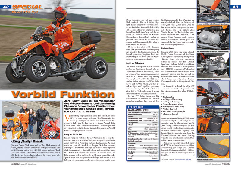 Vorbild Funktion: Jörg ‚Sully‘ Blank ist der Webmaster des V-Force-Forums. Und gleichzeitig Ehemann & zweifacher Familienvater. Vier zwingende Gründe also, vorbildlich KFX 700 zu fahren. Wie der V-Force-Webmaster sein Fahrzeug umgebaut hat und wie er es fährt ab Seite 42…