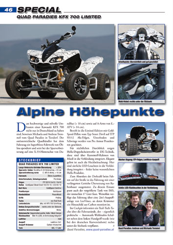 Alpine Höhepunkte: Dass hochwertige und stilvolle Umbauten einer Kawasaki KFX 700 nicht nur in Deutschland zu haben sind, beweisen Michaela und Andreas Tremmel vom Quad Paradies in Teesdorf. Der ostösterreichische Quadhändler hat dem Fahrzeug ein SuperMoto-Fahrwerk von Öhlins spendiert und setzt bei der Spurverbreiterung auf eine X-33-Hinterachse von DuraBlue (+ 10 cm) sowie auf A-Arms von E.-ATV (+ 14 cm)… Auf Seite 46.