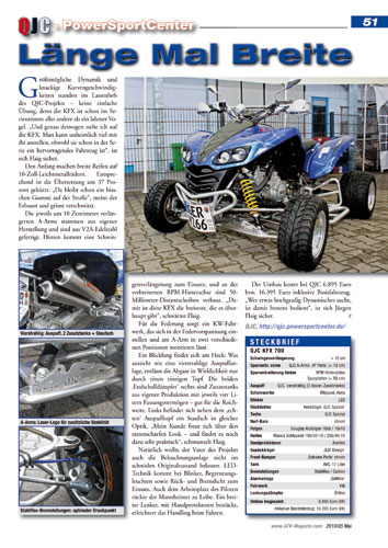 Länge Mal Breite: Größtmögliche Dynamik und knackige Kurvengeschwindigkeiten standen im Lastenheft des QJC-Projekts – keine einfache Übung, denn die KFX ist schon im Serientrimm alles andere als ein lahmer Vogel. „Und genau deswegen stehe ich auf die KFX. Man kann unheimlich viel mit ihr anstellen, obwohl sie schon in der Serie ein hervorragendes Fahrzeug ist“, ist sich Flaig sicher… Auf Seite 51.