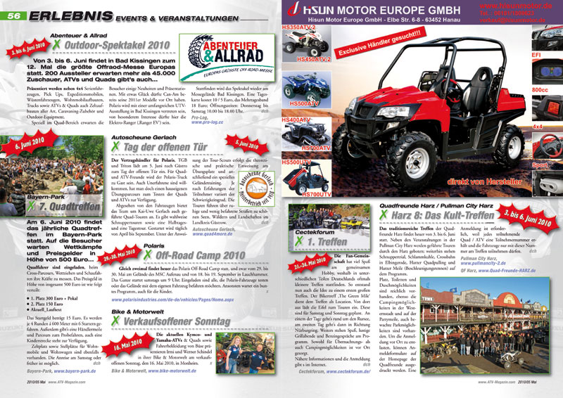 Abenteuer & Allrad: Outdoor-Spektakel vom 3. bis 6. Juni 2010 in Bad Kissingen; Autoscheune Gerlach: Tag der offenen Tür am 5. Juni 2010; Bayern-Park: 7. Quadtreffen am 6. Juni 2010; Bike & Motorwelt: Verkaufsoffener Sonntag am 16. Mai 2010; Polaris: Off-Road Camps am 29. und 30. Mai und am 18. und 19. September 2010; Cectekforum: 1. Treffen vom 21. bis 24. Mai 2010; Harz 8: Das Kult-Treffen vom 3. bis 6. Juni 2010… Seite 56 und 57.