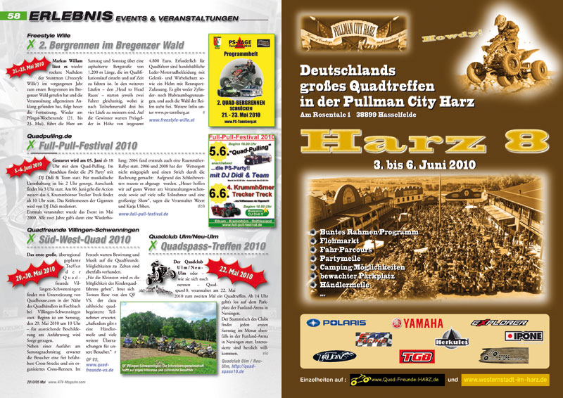 Freestyle Wille: 2. Bergrennen im Bregenzer Wald vom 21. bis 23. Mai 2010; Quadpulling.de: Full-Pull-Festival am 5. und 6. Juni 2010; Quadclub Ulm/Neu-Ulm: Quadspass Treffen am 22. Mai 2010; Quadfreunde Villingen-Schwenningen: Süd-West-Quad am 29. und 30. Mai 2010… Seite 58.