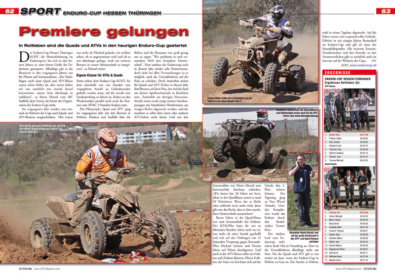 Der Enduro-Cup Hessen Thüringen ECHT, die Herausforderung im Endurosport, hat sich in den letzten Jahren zu einer festen Größe für Enduristen gemausert. Allerdings gab es die Rennserie in den vergangenen Jahren nur für Piloten auf Solomaschinen. „Die Nachfragen nach einer Quad und ATV-Klasse waren schon früher da, aber zuerst haben wir uns natürlich erst einmal darauf konzentriert, unsere Serie überhaupt zu etablieren”, so Mario Dietzel vom MC Saalfeld, dem Verein, der hinter der Organisation des Enduro-Cups steht… Lars Koch berichtet ab Seite 62