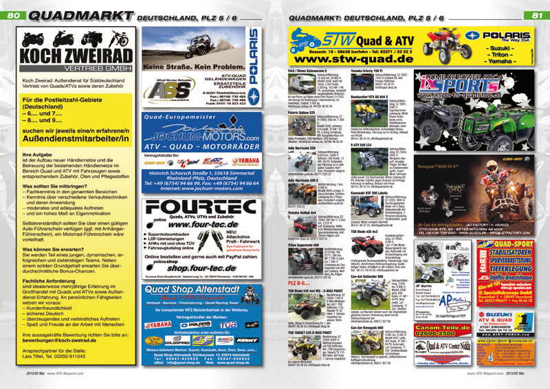 Quad-Messen & Ausstellungen; Quad-Treffen; Quad- und ATV-Vermietungen und Touren-Veranstalter in Deutschland… Ab Seite 60.