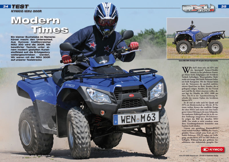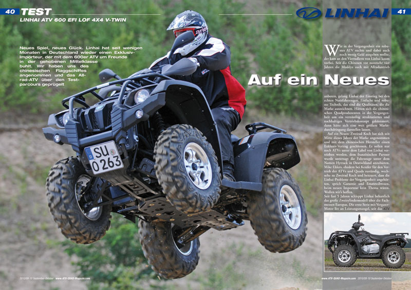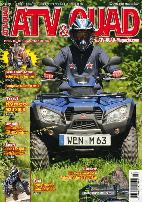 …ist am 30. September 2010 erschienen. Im Mittelpunkt stehen ein Test der brandneuen Kymco MXU 300R und der Linhai ATV 600 sowie die Präsentation der Can-Am Commander 1000 und ein ausführlicher Bericht über den QRP-Umbau einer Yamaha Raptor mit dem 4-Zylinder-Triebwerk einer Yamaha FZR 600. ihre helle Freude an der Lektüre dieser Ausgabe werden auch die Freunde des Schlamm-Quaddelns haben…