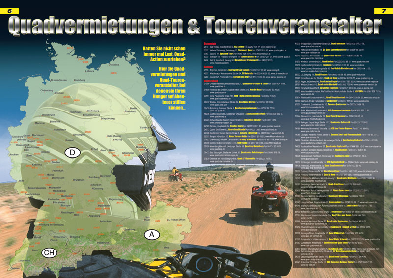 Unsere Übersicht über Quadvermietungen und Tourenveranstalter in Deutschland, Österreich und der Schweiz haben wir weiterentwickelt und präsentieren auf Seite 6 und 7 auf einer Landkarte des deutschsprachigen Raums 69 Unternehmen, bei denen vom ersten ‚Gehversuch‘ mit dem Krabbelzeug bis hin zum Hardcore-Event im extremen Offroad vielfältiger Quadfahrspaß angesagt ist…