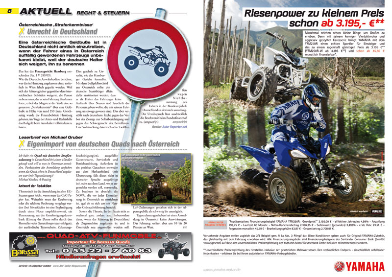 So genannte ‚Straferkenntnisse‘, mit denen die Alpenrepublik versucht, Geldbußen von deutschen PKW-Haltern einzutreiben, widersprechen mitunter dem deutschen Recht und sind damit in Deutschland unzulässig. Worauf es hier ankommt, was beim Eigenimport von ATVs und Quads aus Deutschland nach Österreich zu beachten ist, ob für eine Fahrzeugklasse ‚Motorrad vierrädrig‘ ein Motorrad-Führerschein erforderlich wäre und die Pläne des EU-Parlaments, die Zulassungen für Traktoren und Zugmaschinen zu vereinheitlichen ab Seite 8