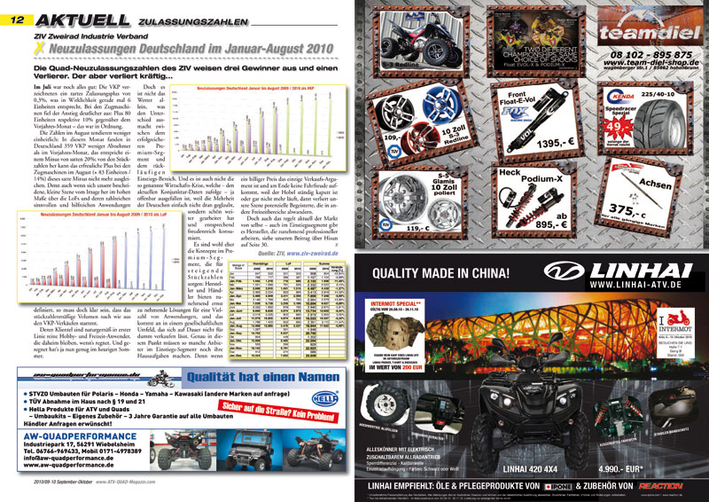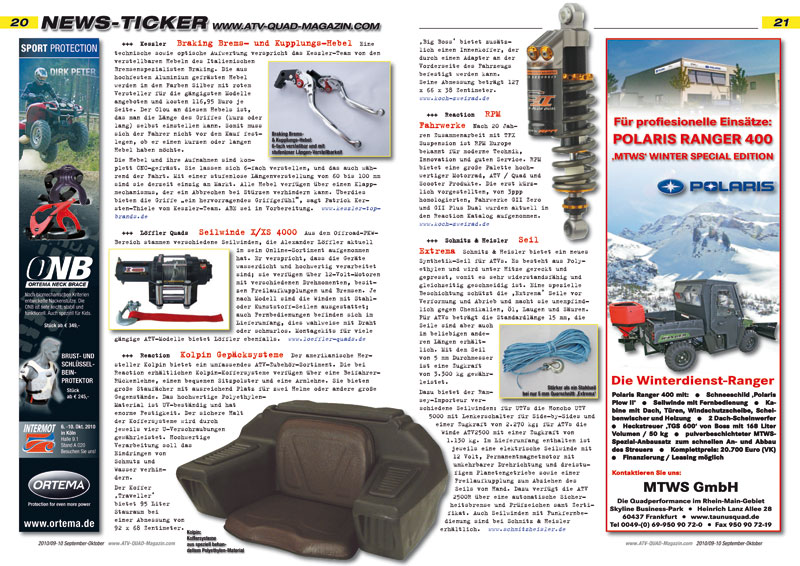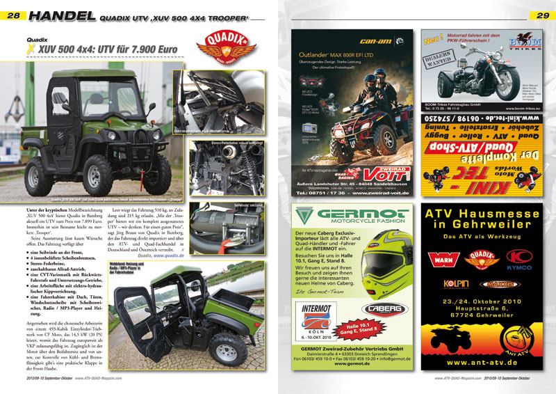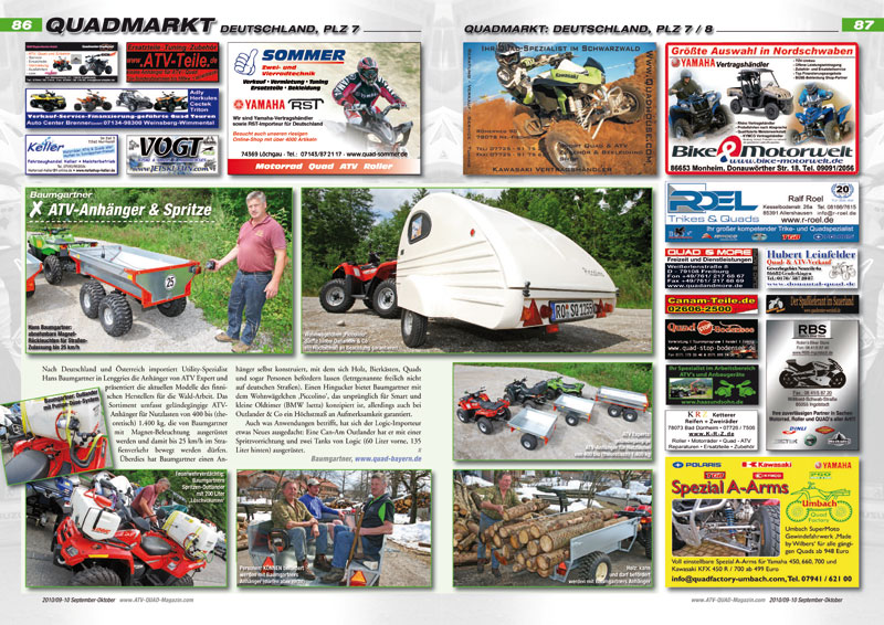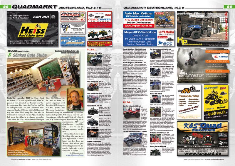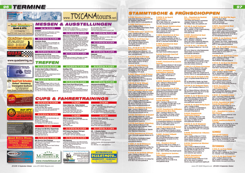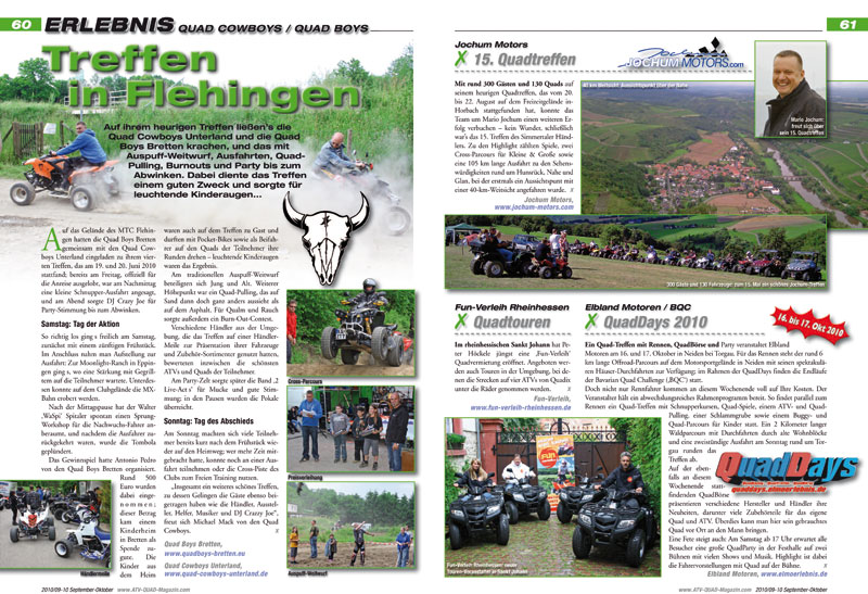 Quad Cowboys: Treffen 2010; 15. Quadtreffen von Jochum Motors; Fun-Verleih: Vermietung und Touren in Rheinhessen; BQC / Elbland Motoren: QuadDays 2010; Action Quad: 2. Arctic Cat Treffen; BFQ: 8. Offroad Camp ‚Mud & Trial‘; Ant-ATV.de: Das ATV als Werkzeug; Quad Store Harz: Quad-Touren und Fahrertrainings im Harz; Lodge-Company.eu: Abenteuer-Urlaub in Ost-Österreich und Ungarn; Buggyracer: Route Harz 2010; Hostettler: Motocross und Racing Markt… Ab Seite 60