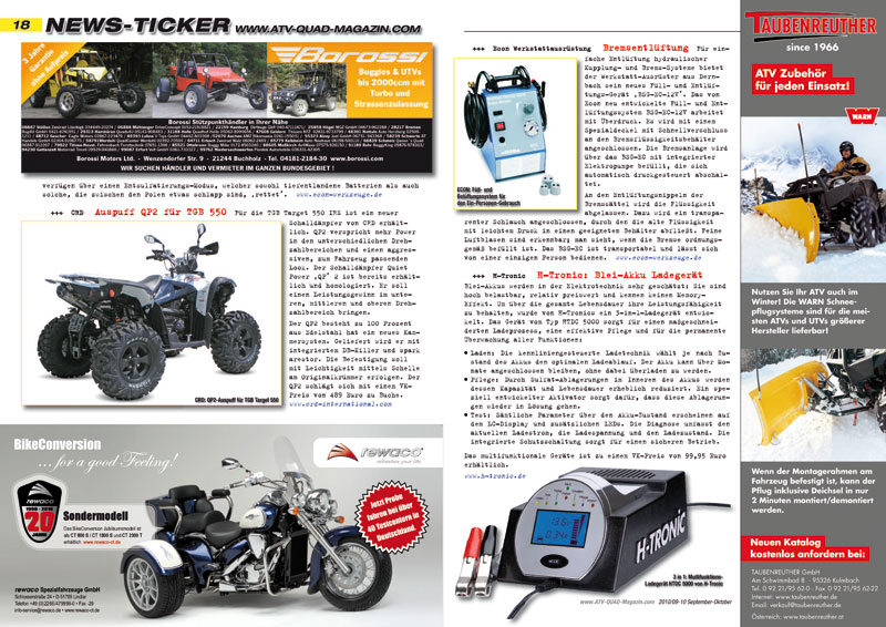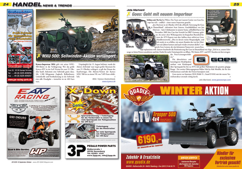 Deutschland / Österreich: TMF Racing übernimmt Import für Omnicompetition; MTWS Quad bietet Polaris Ranger 400 ‚Winter Special Edition‘; Michael Leeb meldet sich in der Quad-Szene zurück; bis 15. Oktober verlängert Kymco-Importeur MSA seine Akton, in deren Rahmen der es beim Kauf einer MXU 500 als Zugabe eine Seilwinge geschenkt gibt; Goes feuert Philco und geht mit neuem Importeur Jets Marivent; Steinmetz bietet Buggys zu Aktionspreisen; Germot übernimmt Caberg-Import; Arctic Cat hat ein neues Management; Quadix kooperiert mit Quad Handel Austria. Ab Seite 22