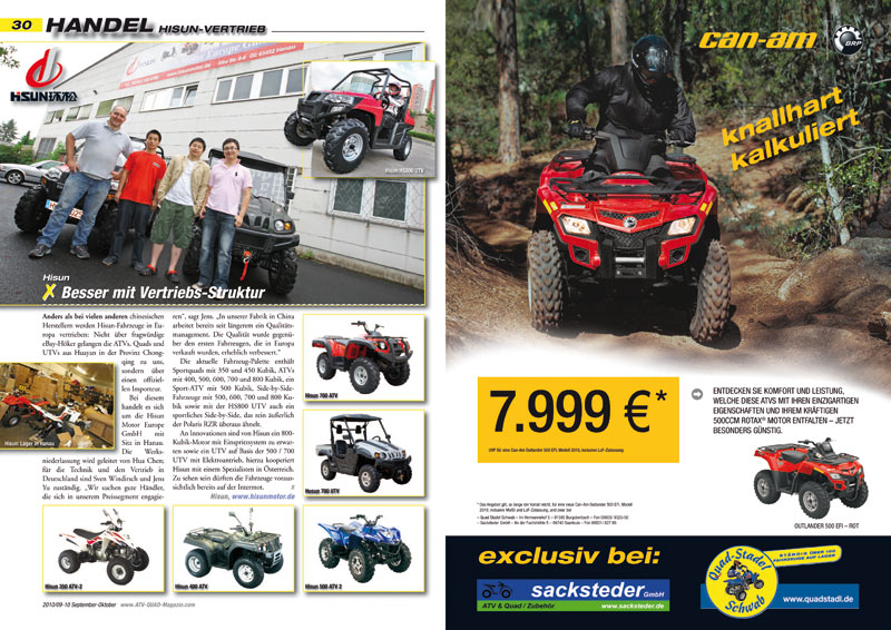 Nicht über fragwürdige eBay-Höker gelangen die ATVs, Quads und UTVs von Hisun aus Huayan in der Provinz Chongqing zu uns, sondern über einen offiziellen Importeur; ATV&QUAD hat den Importeur in Hanau besucht… Seite 30