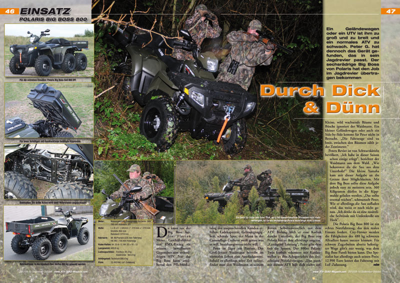 Ein Geländewagen oder ein UTV ist ihm zu groß und zu breit und ein normales ATV zu schwach. Peter G. hat dennoch das Gerät gefunden, das in sein Jagdrevier passt. Der sechsrädrige Big Boss von Polaris hat den Job im Jagdrevier übertragen bekommen… Seite 46