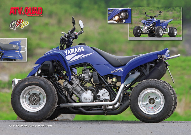 Von vorne sieht das Fahrzeug aus wie eine hundsgemeine alte Raptor. Am Heck lassen zwei Endtöpfe aufhorchen, die wir von einer Yamaha R1 her kennen. Selbst von der Seite darf sich der Betrachter nicht von den 660er Aufklebern beirren lassen: Mit 600er Vierzylinder-Triebwerk ausgestattet, hat die QRP-Raptor gut doppelt so viel Power wie die serienmäßige Alt-Ypse. Gut, dass Uwe Bergmeister das wusste, bevor er mit der QRP Yamaha FZR 600 Raptor zum ersten Mal Gas gab… Seite 50