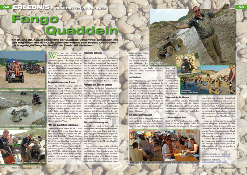Am 21. und 22. August zelebrierte der Quadclub Ostschweiz gemeinsam mit den Mitgliedern des ATV-Quad Bodensee-Forums sein zweites Quadtreffen – mit ausgiebigen Fangobädern für alle Zwei- und Vierbeiner… Seite 54