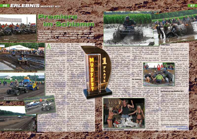 Zum ersten Mal haben die Free Quadler Mecklenburg Vorpommern am 11. September 2010 ihr ‚Mudfest 9/11‘ steigen lassen, und zwar auf dem Hof Denissen in Wöbbelin. Dabei ist kein Auge trocken geblieben… Seite 56