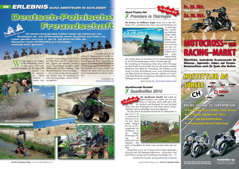 Ein länderverbindendes Treffen haben die Initiatoren von Quadlegion.de und ATVFunsQuad, einem Quadclub aus Polen, ins Leben gerufen und vom 11. bis 14. Juli 2010 mit Hilfe der Menschen hinter ATVPOLSKA.pl in Schlesien erstmals wahr gemacht. Außerdem: Quadtreffen 2010 der Quadfreunde Rureifel; Quad Trophy Ost: Premiere in Thüringen… Ab Seite 58
