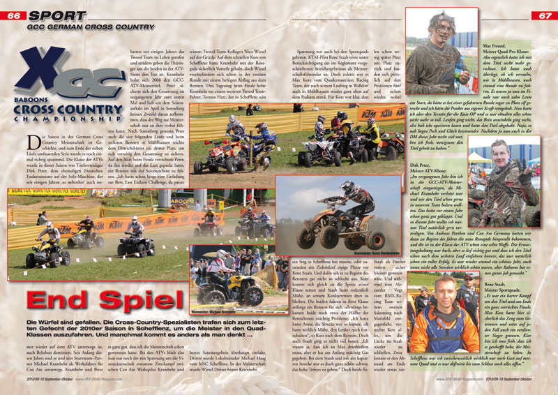 End Spiel: Die Würfel sind gefallen. Die Cross-Country-Spezialisten trafen sich zum letzten Gefecht der 2010er Saison in Schefflenz, um die Meister in den Quad-Klassen auszufahren. Und manchmal kommt es anders als man denkz… Seite 66