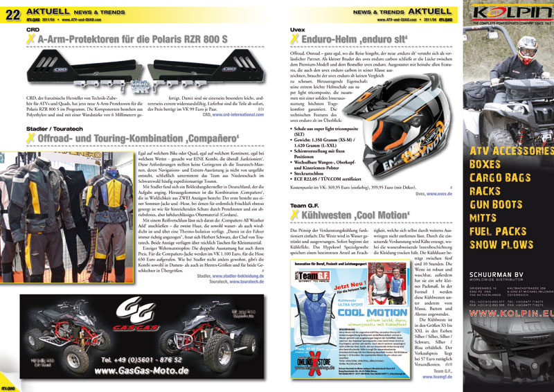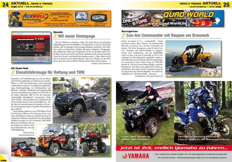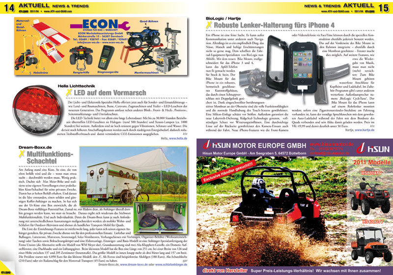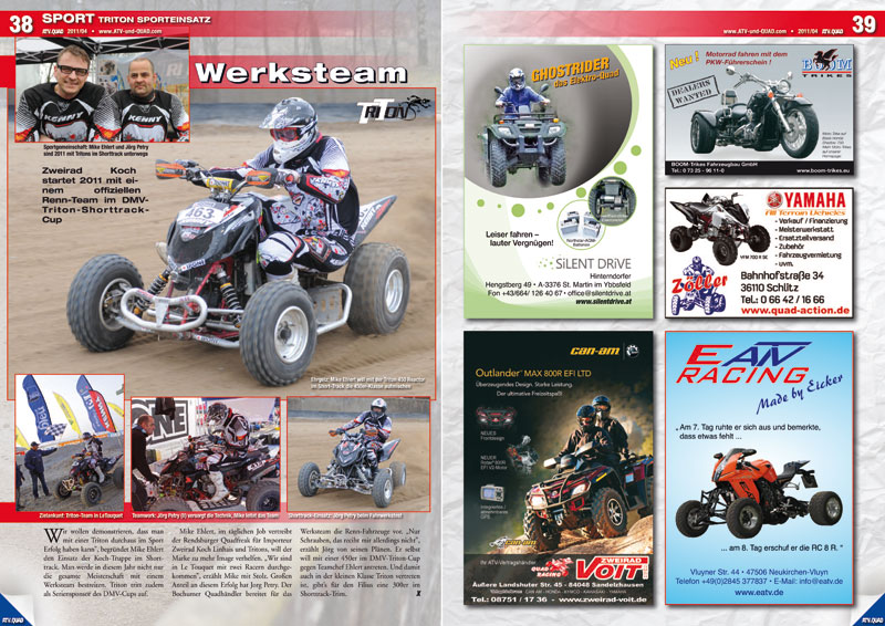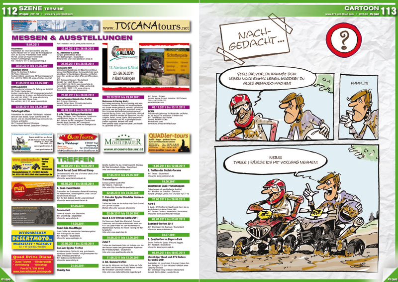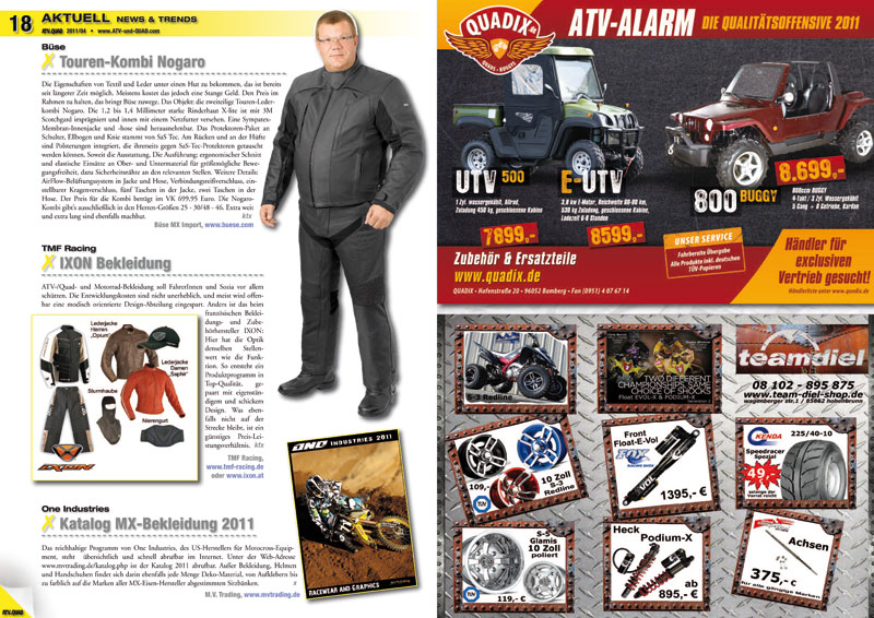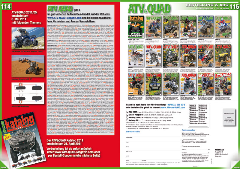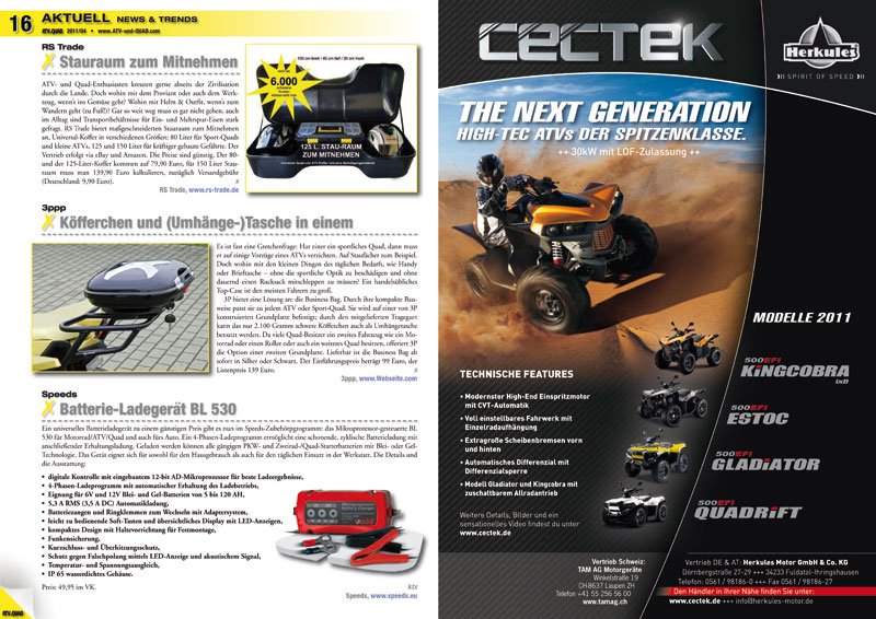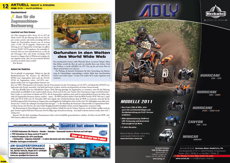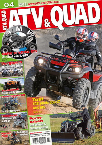 Und weiter so: Wieder 116 Seiten stark ist Ausgabe ATV&QUAD 2011/04, die ab 8. April 2011 am Kiosk zu haben ist. Streng geheim und aufgedeckt in ATV&QUAD: Die BMW R 1200 GS gibt´s demnächst als Quad. Weiterhin im Mittelpunkt steht ein Vergleichstest der Adly Hurricane 320 SM gegen Triton Supermoto 300 sowie ein Test der ersten zweisitzigen TGB…