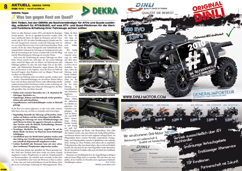 Dirk Tietjen, bei der DEKRA als Sachverständiger für ATVs und Quads zuständig, erläutert für ATV&QUAD, auf was ATV- und Quad-PilotInnen für die Wert- und Funktions-Erhaltung ihrer Fahrzeuge achten sollten. Seite 8.